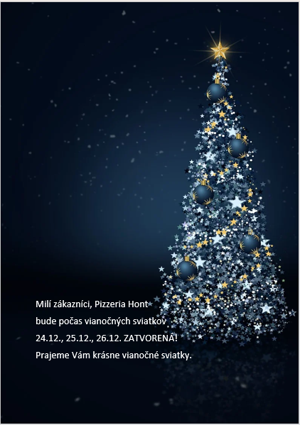 Milí zákazníci, 23.12.2025 bude Pizzeria Hont otvorená len do 19:00 hod. Ďakujeme za pochopenie.